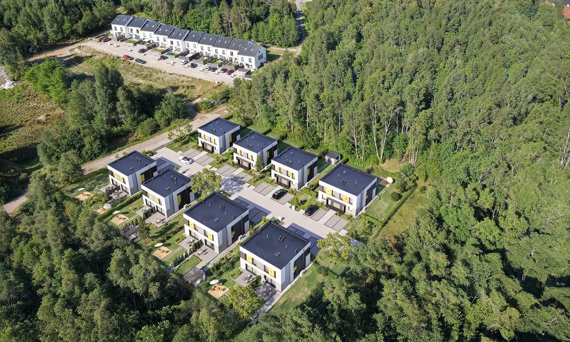 Unikalna forma nie odcina się od zieleni wokół, lecz subtelnie ją dopełnia. Dzięki temu domy stają się atrakcyjnym punktem w krajobrazie, jednocześnie podkreślając naturalny urok okolicy.